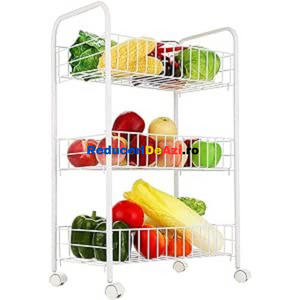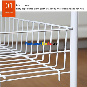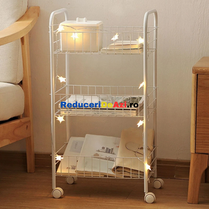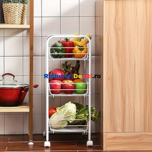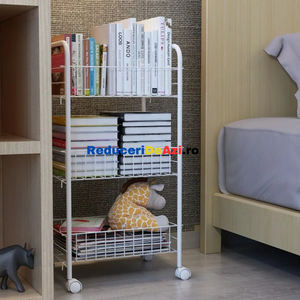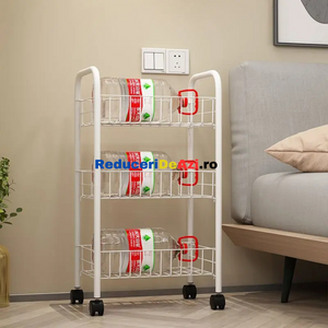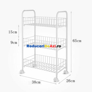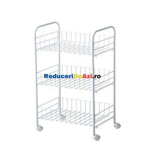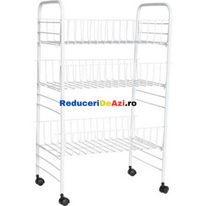 Etajera din metal cu roti si 3 rafturi Aceasta iti vine in ajutor pentru a reusi sa iti organizezi mult mai bine lucrurile. O poti folosi fie in bucatarie, pentru a pune anumite alimente, borcane, fie in baie pentru a pune prosoape, produse de curatenie sau orice mai ai nevoie. Aceasta poate fi folosita si la un loc de munca, precum la saloanele de infrumusetare, in farmacii etc. Cele 3 nivele sunt orientate in stil etajera, unul peste altul, pentru a economisi spatiu. Este o etajera portabila, avand 4 rotile cu mobilitate 100%, adica se rasucesc 360 de grade, pentru a usura deplasarea acesteia, chiar si cand are lucruri in interior. Fiind de culoare alba, aceasta ae va incadra perfect in orice gospodarie sau loc de munca. Dimensiuni 34x26x70 cm
