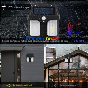 Construita din materiale rezistente la intemperii, aceasta lampa solara poate rezista la conditii meteorologice variate, de la ploi abundente pana la zapada sau inghet.