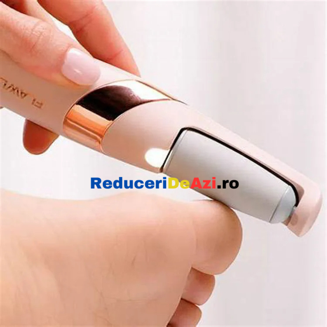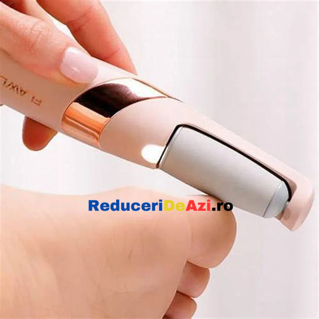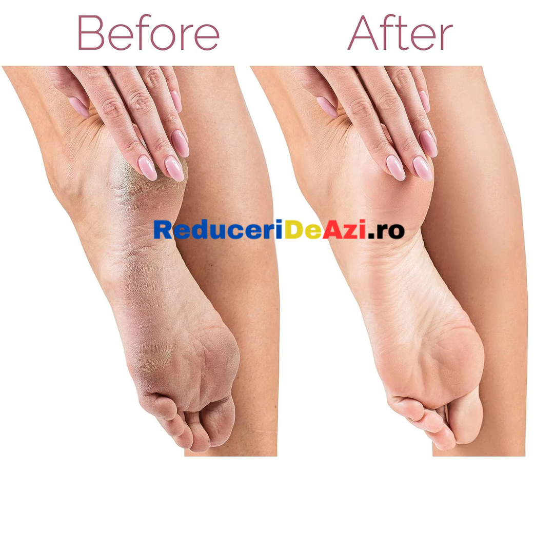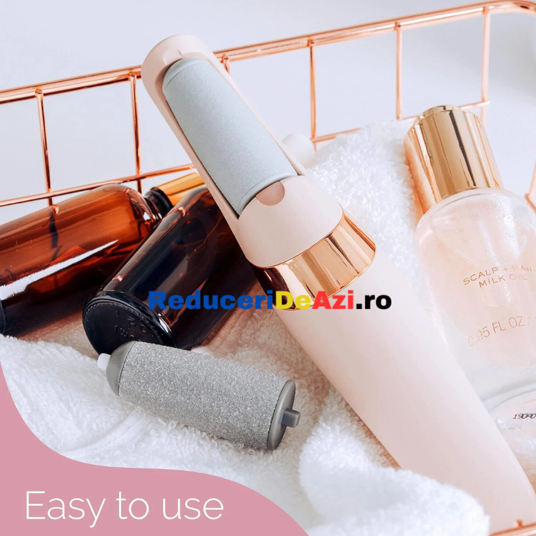 Rola gliseaza cu usurinta deasupra contururilor talpilor tale, indepartand fara efort pielea uscata si dura, in doar cateva secunde.