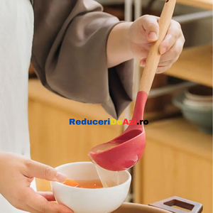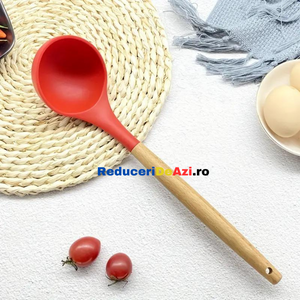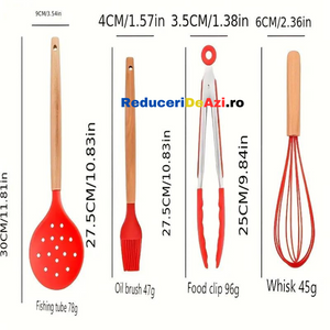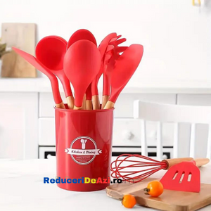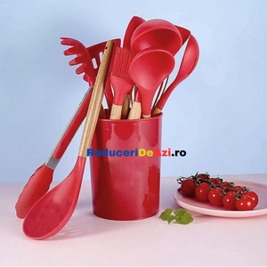 Set ustensile bucatarie 12 piese Lemn si Silicon alimentar Termorezistente Antiaderente Suport Blat Rosu