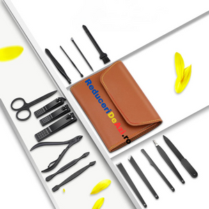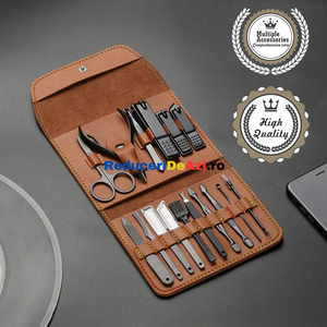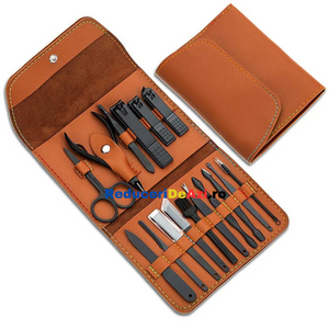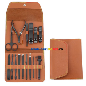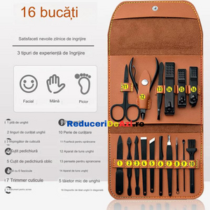 Acest kit de manichiura profesional contine 16 instrumente intr-o trusa din piele ecologica de lux si convenabila.