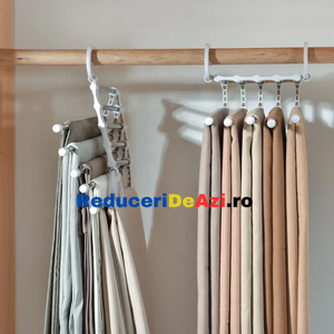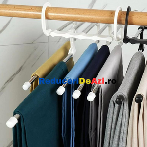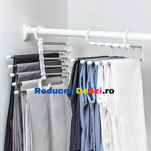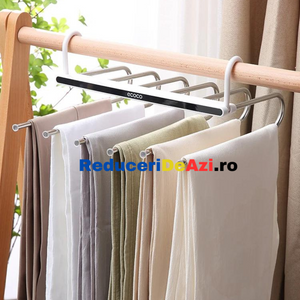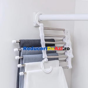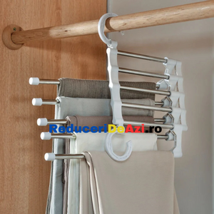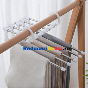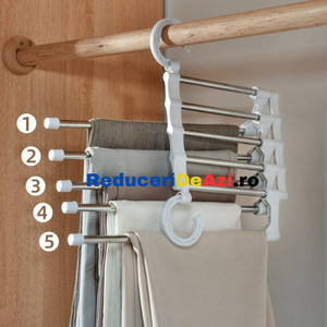 - Te ajuta sa gasesti usor pantalonii, deoarece tijele de sustinere sunt mobile si pot fi deplasate, ceea ce face mai usoara atarnarea pantalonilor.